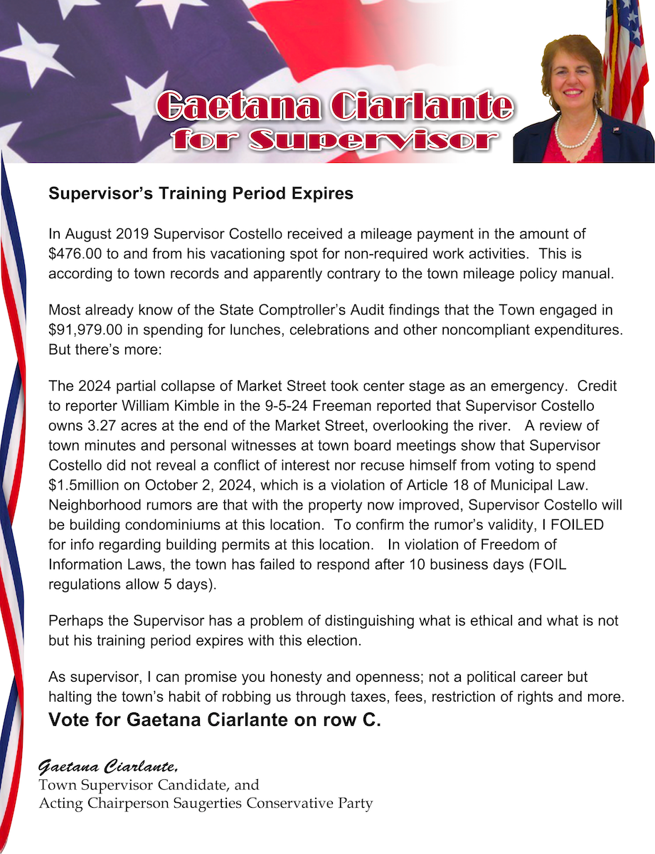 Look for information about Gaetana Ciarlante (supervisor candidate), Mike Sasso and Zach Horton (town councilmen candidates)